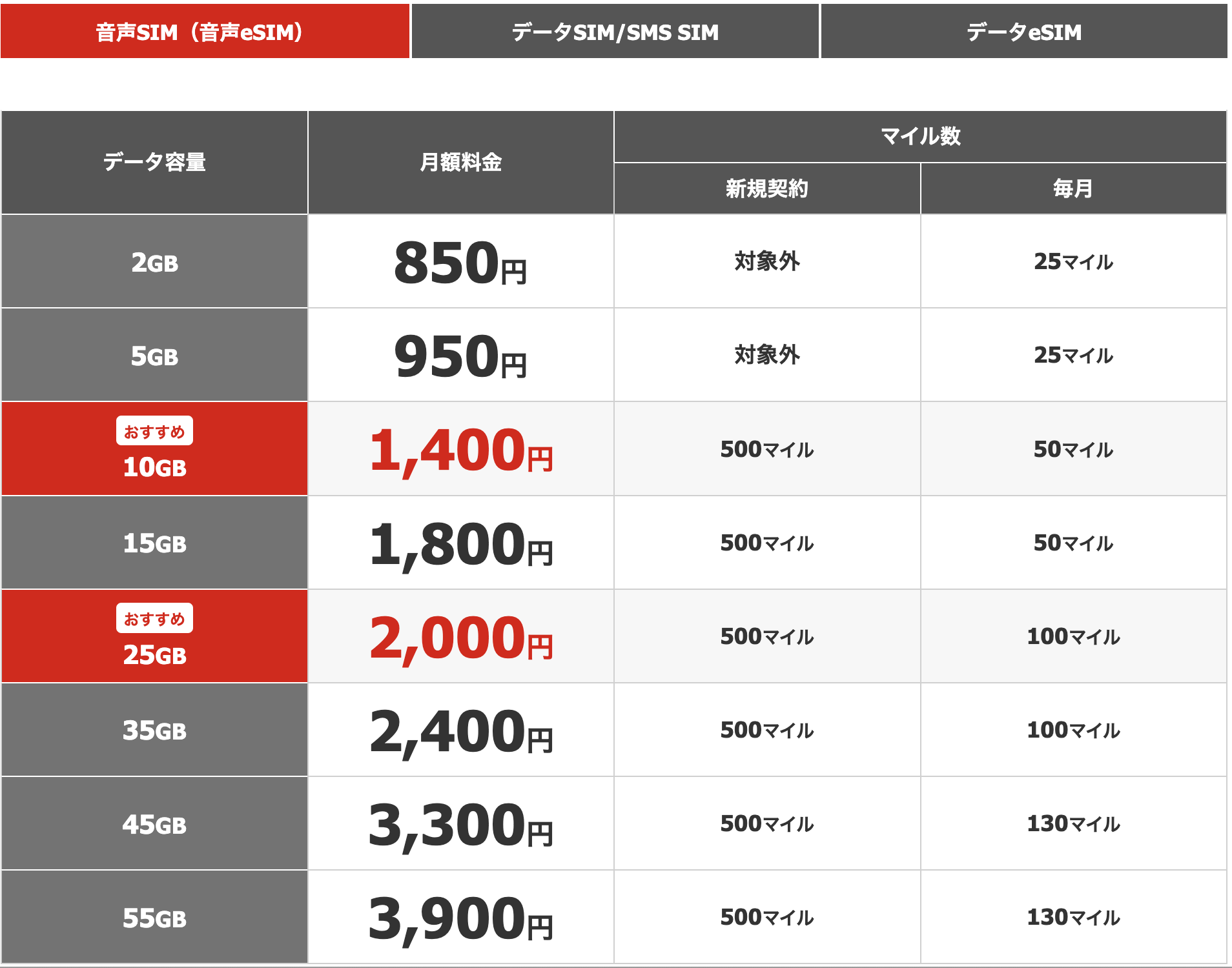 マイルを貯める目的であれば、「音声SIM(音声eSIM)」一択かなと個人的に思います。